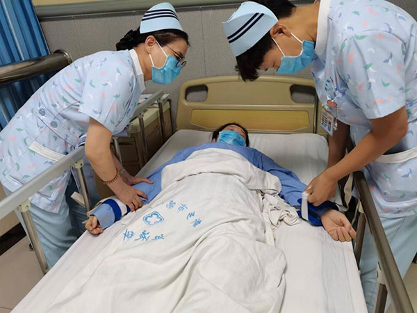 作为“患者甲”的耿护士长说:“这真是一次终生难忘的体验啊!”体验过腰穿体位后才知道那个姿势真的是太累了,护士在对她进行腰部皮肤消毒的时候已经开始深深地恐惧了,感觉棉签经过的地方都有种冰凉的刺痛感。要在这样的恐惧下一动不动地配合医生完成腰椎穿刺,绝对需要巨大的勇气。而在床上被约束带束缚住双手,更是有种癫狂的感觉,不自觉地就想挣扎,想抗拒,不能忍。床上使用便器太难受,躺着不仅感觉排不了便,硬邦邦的便器使用起来还特别不舒服。