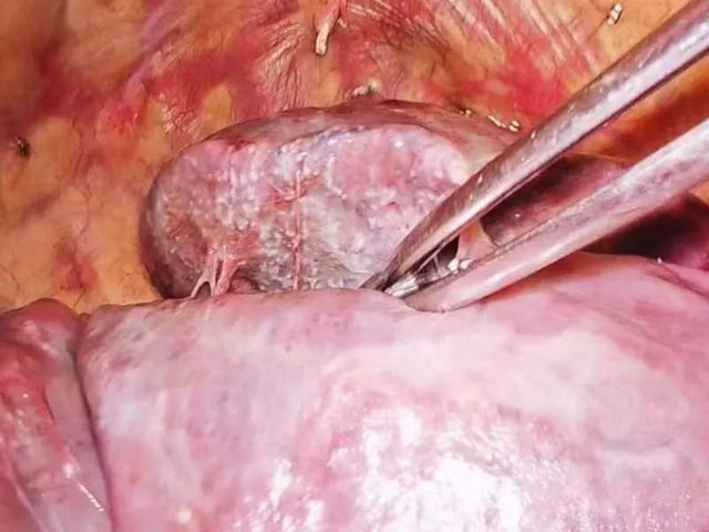 入科后副主任张颖博及时给予复查胸部CT,可见双肺间质弥漫性纤维化,请内分泌科医师会诊考虑系统性红斑狼疮,未规范治疗导致肺部间质弥漫性纤维化,因患者病重与家属沟通,在积极行术前准备后于住院第3天行胸腔镜下肺大切疱除术,术中探查见患者右侧肺组织质硬如石。胸外科团队依据丰富的手术经验,术中快速解决病变肺组织,患者术后恢复良好。