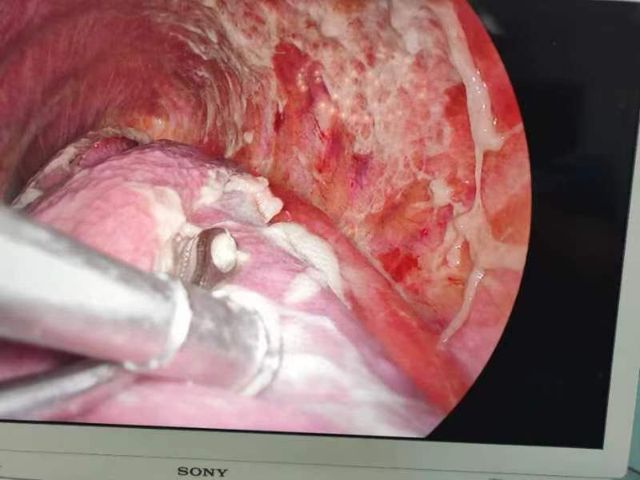 患者中年女性,5天前吃鱼时不慎被鱼刺卡住,自行食用馒头、喝醋,以期望将鱼刺咽下,在家三天,胸部疼痛症状愈发加重,前往我院就诊,胸部CT提示食管下段异物,伤及食管外膜,胃镜下将鱼刺取出后,给予禁饮食等对症治疗未见明显好转,1天后复查胸部CT提示纵隔脓肿形成,心胸外科团队当机立断,急诊行胸腔镜下纵隔脓肿切开引流。