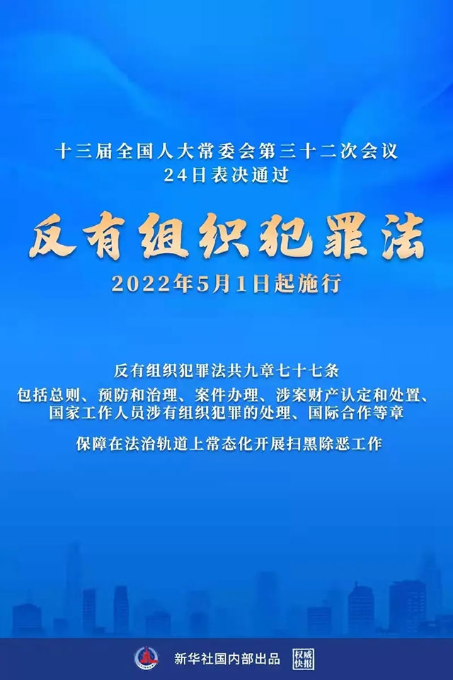 2021年12月24日,十三届全国人大常委会第三十二次会议审议通过《反有组织犯罪法》。同日,国家主席习近平签署第101号主席令予以公布,将于2022年5月1日起正式实施。日前,全国扫黑办专门印发通知,要求切实抓好《反有组织犯罪法》贯彻实施工作,依法严惩涉黑涉恶违法犯罪,推动常态化扫黑除恶斗争深入开展,为党的二十大胜利召开创造安全稳定的政治社会环境。
