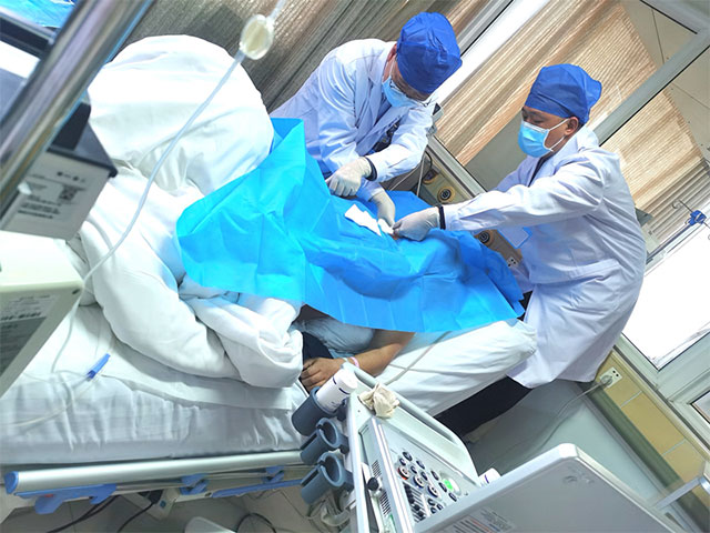 此外,患者处于低血压状态,需股动脉作为血管通路行动脉内球囊反搏术,因此颈内静脉穿刺置管变成了透析通路较好的选择。颈内静脉穿刺置管相对于股静脉较为严格,要求患者头低仰卧位进行操作,然而患者半卧位便有胸闷、气短的症状出现,于是在透析室庞主任的带领及指导下,进行了多人合作,在多普勒超声引导下行高卧位颈内静脉穿刺置管术,置管难度明显增加,尽管在穿刺过程中王大夫穿刺姿势极度不适、拿取器材困难、同时要严格按照无菌操作的前提下,仍可以技术娴熟的操作,并顺利的完成了穿刺置管,可显技术之高超,置管结束后患者的一句“辛苦了,谢谢大夫,给你们带来麻烦了”让人瞬间破防,患者无需自责,救助您是我们的职责所在,而医患之间的相互理解让医务工作者感到了满满的欣慰,觉得所做的一切都变得值得。