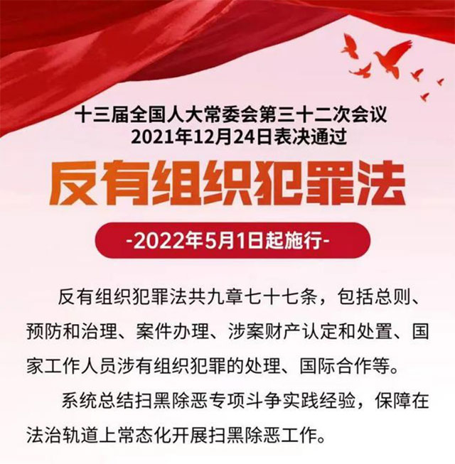《中华人民共和国反有组织犯罪法》自2022年5月1日起施行
