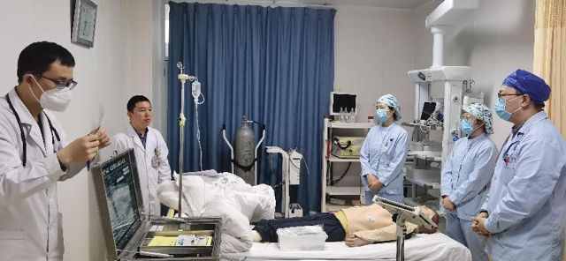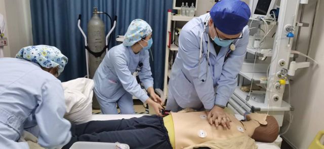 本次急救大练兵历时2周,分为13组进行。尤其是新入职及低年资医护人员,成为此次培训的重点对象。培训内容包括高级生命支持,其目的为促进心脏恢复搏动,恢复自主呼吸,改善心、脑等重要脏器灌注,而这就需要由训练有素且配合默契医护团队来完成。为了更有效、更规范地实施ACLS,提高团队应急救治能力,科室要求每组人员认真对待,积极准备,严格按照《2020年美国AHA心肺复苏指南》要求,演练内容涵盖胸外按压、气道管理、电除颤、复苏药物、心电图识别、复苏后处理等。医护人员协作默契,合理分工,有条不紊地完成各项急救操作。