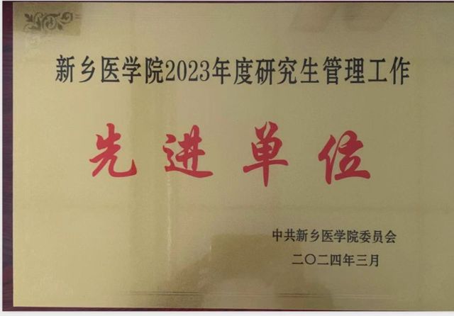 近日,我院在研究生管理工作方面传来喜讯,荣获 “新乡医学院2023年度研究生管理工作先进单位”。